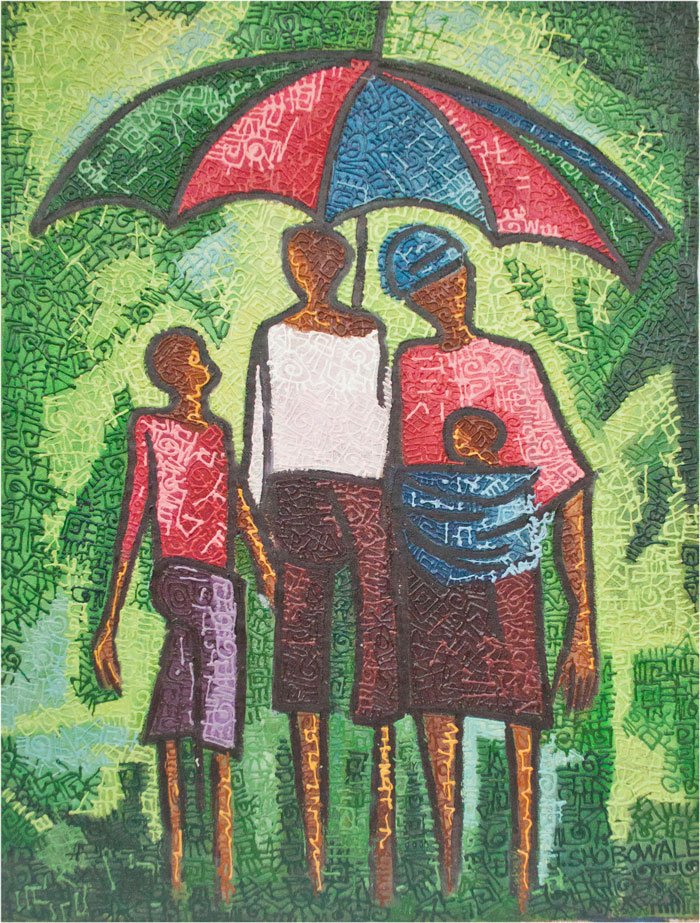 The painter celebrates what he thinks to be a vanishing phase of the Nigerian life. The composite family units doing things together, even in noticeable minor things like having babies strapped to their mothers’ back.