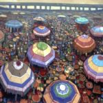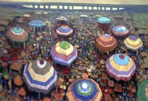 This painting celebrates open marketplaces in Africa and is the artist’s impression of large market arenas typical of cities and townscapes all over Nigeria and West Africa.