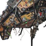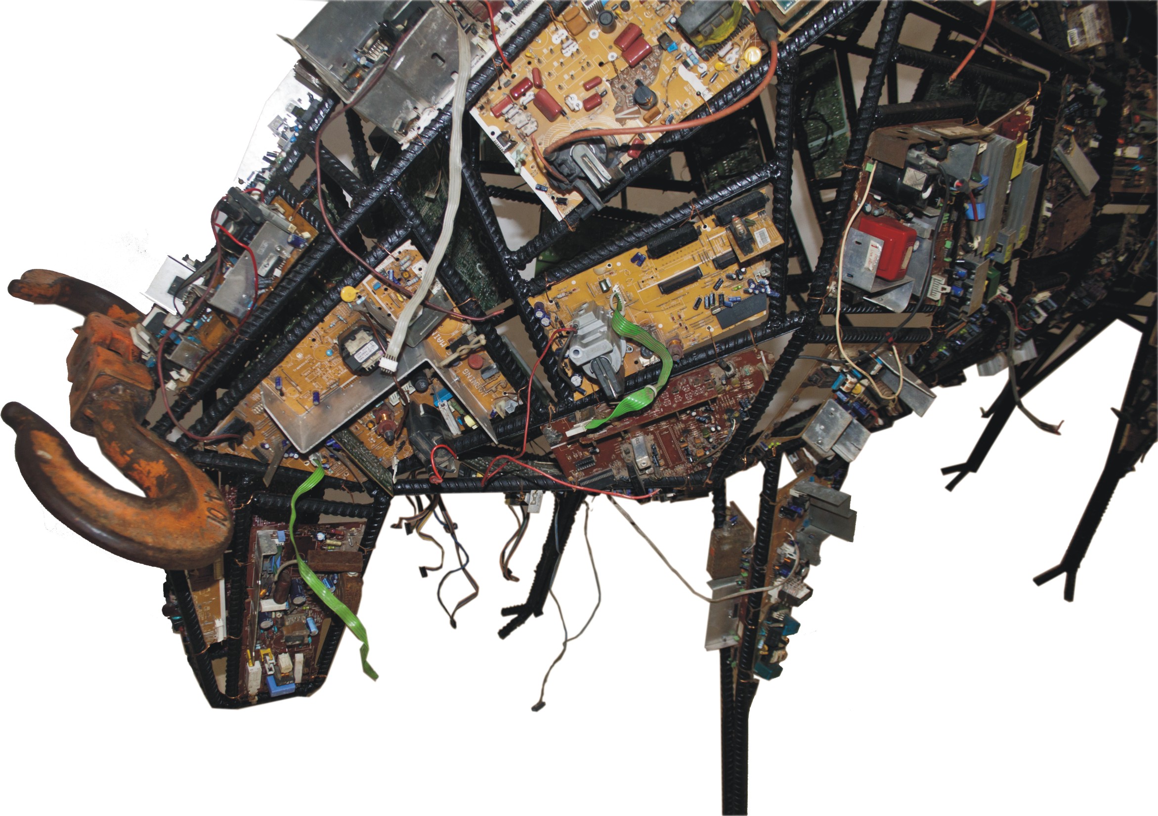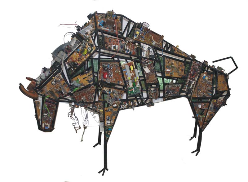 This metal and computer panel sculpture of a full-size bull asserts a tremendous presence especially because of the use of the most unlikely of materials.